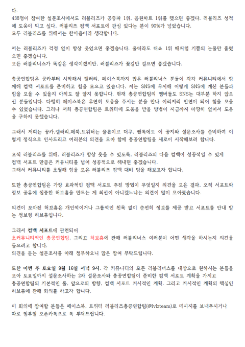또한, 이번 주 토요일 9시. 설문조사 결과를 가지고 총공연합팀 룰과 방향, 계획. 그리고 허브홈에 관해 회의를 하고자 하오니 이 회의에 참여하고 싶으신 분은 페이스북, 트위터 @lvlzteam 또는 오픈카톡으로 메시지 부탁드립니다.