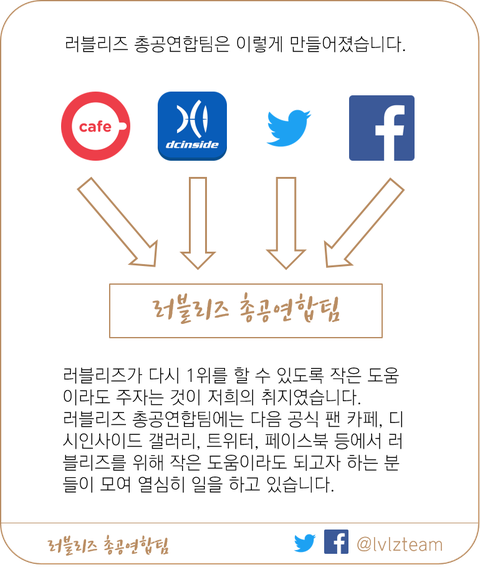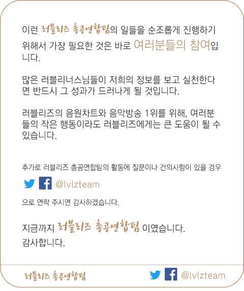 총공연합팀은 러블리즈가 꽃길만 걷길 바라며 러블리즈 갤러리, 공식 팬카페, 트위터, 페이스북, 더쿠, 팬톡. 그 외에 모든 러블리즈 커뮤니티에 있는 러블리너스의 힘을 모아 컴백 서포트를 하고 싶습니다. 그래서 두 가지를 여러분에게 물어 의견을 모으고자 합니다.