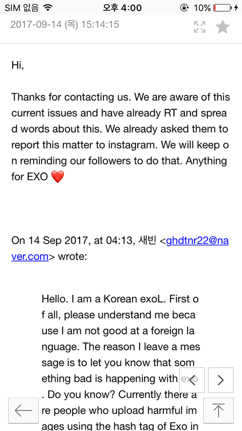문의 주셔서 감사합니다. 우리는 현재의 문제를 인식하고 이미 이것에 대해 단어를 확산. 우리는 이미 인스타그램에 이 문제를 보고했고 그들에게 문의했다. 우리는 엑소를 위해서라면 추종자(악플러)들에게 이 문제를 상기시켜 줄 것입니다.