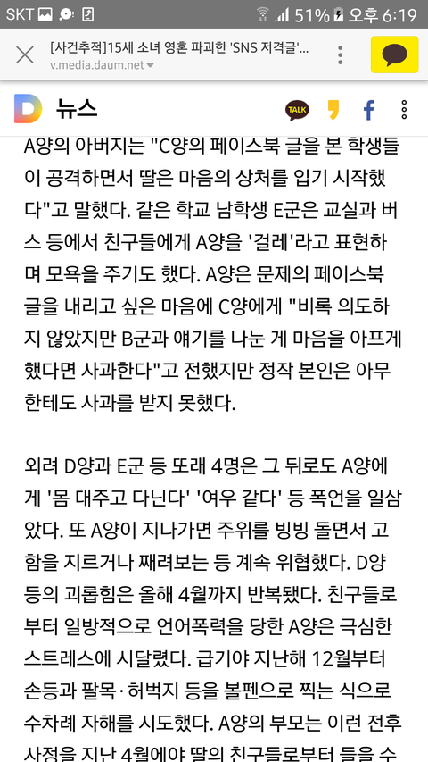 - 피해자는 문제의 페이스북 글을 내리고 싶은 마음에 가해자에게사과했지만 정작 본인은 아무한테도 사과를 받지 못했습니다. 그 이후에도 여러 가해자들은 그 뒤로도 피해자에게 '몸 대주고 다닌다' '여우 같다' 등 폭언을 일삼았으며, 지나가면 주위를 빙빙 돌면서 고함을 지르거나 째려보는 등 계속 위협했습니다.