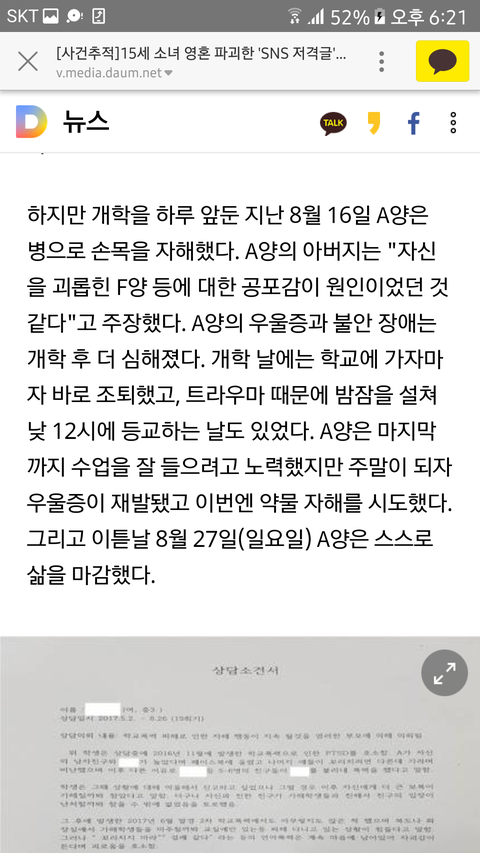 -여름방학이 시작 된후 피해자는 안정을 되찾았지만, 개학 하루전인 8월 16일 자신을 폭행한 가해자에 대한 두려움과 공포감으로 자해를 하였습니다. 그러다 두려움을 참지 못하고 8월 27일 피해자는 스스로 옥상으로 올라가 삶을 마감했습니다.