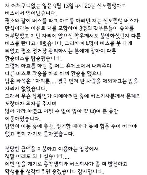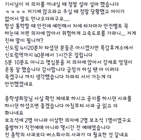 한서대학교 대나무숲에 올라온 사진입니다서울고려관광 신정관광이라고하는데 정확한 확인이 필요할것같네요고속도로 다니는버스에 포장마차의자가 웬 말인가요학생의 입장을 대변해야하는 총학생회는 말로만 시정하겠다하고 묵묵부답입니다답답하네요 정말학교,총학생회,버스회사에 이미 여러분 문의하였지만 정작 바뀌는건 하나도 없었습니다어디 신고,제보할곳없을까요?