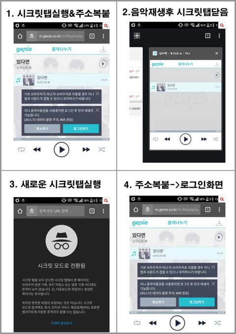 음악나누기 할 때 가장 추천하는 방법은 크롬앱을 이용하는 거야. 크롬에서는 음악나누기 링크가 새탭으로 열리기 때문에 이미 열려있는 다른 탭들을 자유롭게 이용할 수 있어! 안드로 핸드폰을 이용하는 경우에는 시크릿탭을 이용하면 로그인-로그아웃이 더 쉬워. 그건 다음 질문에서 같이 설명할게.