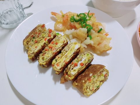 크림새우는 마요네즈 식초 레몬즙 설탕으로 소스만들었어요. 계란말이는 사각팬을 사야겠어요 예쁘게 잘 안말려요....ㅠ.ㅠ이렇게 한상