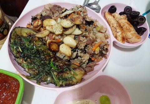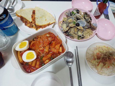 오랜만에 맛있게 밥 먹었네요 반주 꼴깍봉골레 파스타랑 퀘사디아 만들고 떡볶이도 같이 먹었어요 무슨 조합이죠 이건? ㅋㅋㅋㅋㅋㅋ 파스타에는 봉골레도 듬뿍 마늘 듬뿍 고추 듬뿍넣어서 매콤하게 먹었습니당명란구이 가지구이랑 마늘볶음밥이에요.
