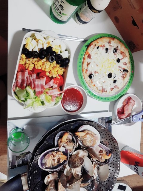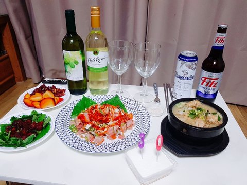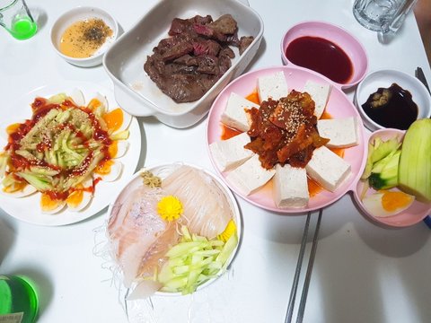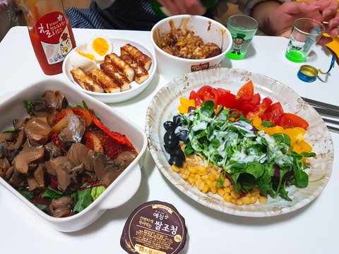 삼계탕이랑 마트에서 회 사다가 회무침 해서 같이 먹었네요. ㅋㅋㅋ이건 친구랑 한잔 했던 상이네요. 꼬막인가 골뱅이 무침이랑 구워먹는 치즈, 샐러드, 타코야끼랑 간단히 한잔했습니다!마트에서 모듬 조개 사다가 해감해서 조개찜 하고 콥샐러드랑 피자랑 한 상 거하게 차렸네요! 손이 커서 문제.....ㅠㅠ저기 계란초무침? 저게 별거 아닌데 정말 맛있었어요. 반숙으로 삶은 계란에 오이 썰어 올리고 초장 뿌려서 같이 먹으면 짱맛!!!!ㅠㅠ 한 번 드셔보세요. 삼각살이었던가 고기랑 물이 흥건한 두부김치도 있네요ㅠㅠㅠㅋㅋㅋ얼마전에 만든 만두에요. 의욕넘치게 재료 사왔는데 혼자 빚으면서 후회했어요....누구 준다고 이렇게 많이 만드냐며 언제 다 찌냐며 ㅠ.ㅠ 맛은 괜찮았어요!! 찜판이 하나밖에 없어서... 사실 두판 더 있어요