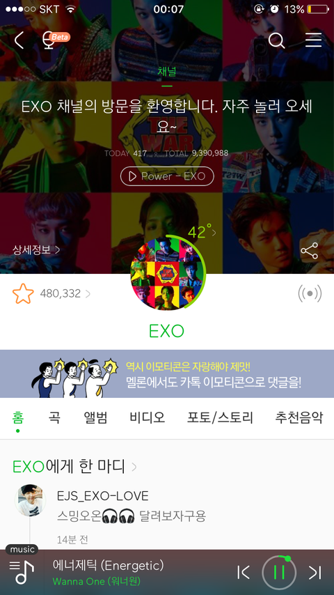 안녕! 나는 타팬이야 타팬인증 해야하나? 내가 엑소노래 듣고 좋아가지고 코코밥 파워 같은거 좋아요 다눌러놨는데 ㅋㅋㅋㅋㅋㅋㅠㅜ 필수라면 멜론 디엔에이 보여줄수 있는데 본진 나오면 좀 그럴까봐 ..