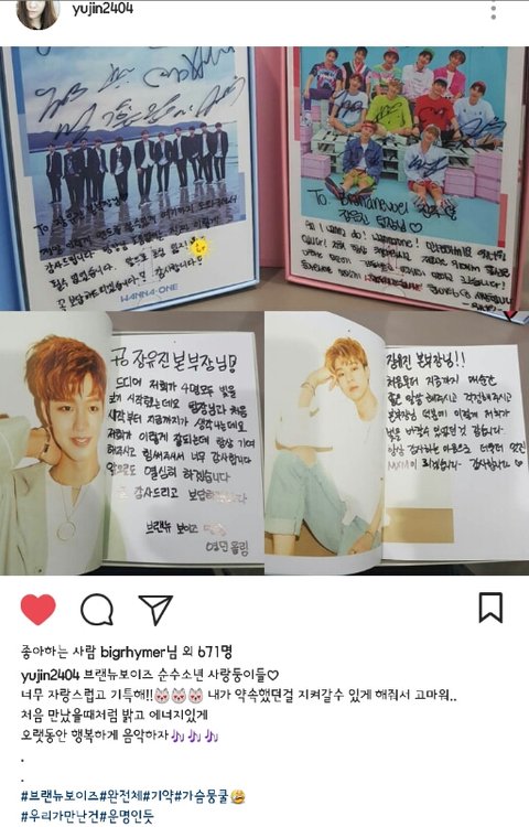 브랜뉴 대표님이랑 본부장님 진짜 다 좋고 영민 동현 우진 대휘 애들도 너무 착한거같아 저렇게 길게 써서 앨범 드리고 애들 진짜 잘큰거같아