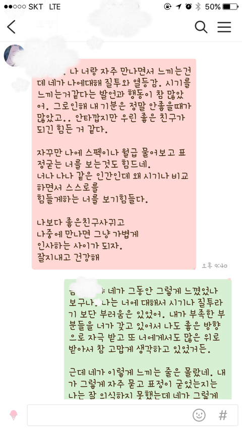 그리고 제가 자존감이 낮긴 해도 저 나름대로 다른 스펙 가지고 있고 오히려 이 친구가 제 스펙을 부러워할 때도 많았어요. 서로 없는 부분을 부러워한 것 뿐인데 이런식으로 반응이 나오니까 너무 어이없고 황당하네요. 시기와 질투라니 ㅎㅎ 헛웃음만 나옵니다.