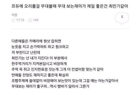 나 권현빈팬인데 아닠ㅋㅋㅋㅋㅋ 민기 ㅅㅅ고생 영업글 댓글에서 주운건데ㅋㅋㅋㅋ 이거봤어??? 봤을수도 있는데 너네 댓글에서 안보이길랰ㅋㅌㅋㅋ 혹시 못본 러브 있을까봨ㅋㅋㅋ 아니 나 이거 본후부터 오리걸 직캠 가끔 봤는데 이제 못보겠어 조빱밐ㅋㅋㅋㅋㅋ