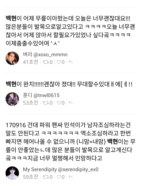 백현이 무릎 괜찮아저서 넘 다행이야.ㅜ