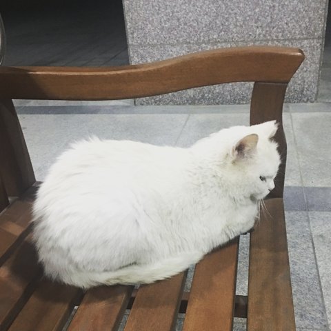 벤치에 옆에 같이 앉아 식빵굽고 앉아 있는 흰둥이
