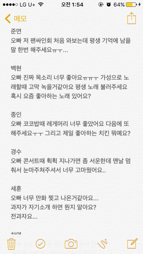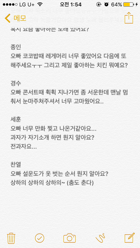 어 너 애들한테 기억남기고 싶으면 닥 이거하셈 ㅇㅇㅇㅇㅇㅇㅇ 박찬열앞에서 한 번 찌그러진 캔은 다시 펴지지않아 드립치고 옆에 경수한테 가서 경수오빠 범실이가 춤추면 뭐게요? 범실범실 꺄르륵 하고 옆에 민석이랑 준면이한테 가서 커튼 ╋ 야하고 싶어에 아재개그 섞어서 개사 부르셈 종인이는 미리 준비한 사탕반지를 꺼내들고 부모님이 주신 행운의 반지! (표정 중요) 하면서 손에 사탕반지 끼워주셈ㅋㅋㅋ 세훈이한테는 그럼 난 조읜성 하면서 턱브이하고 백현이한텐 가서 미친 짓 그만할게요 그만 웃어요 하고 사랑해 하고 쿨하게 퇴장해