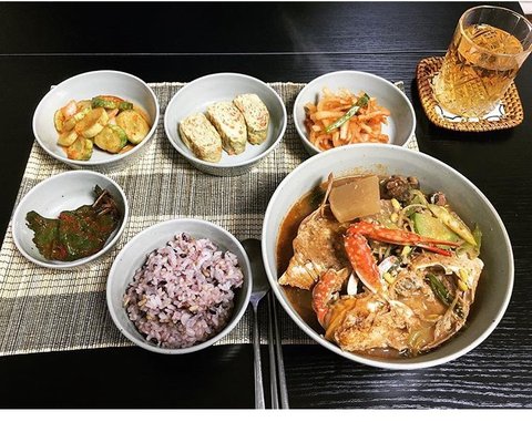 꽃게탕 무생채 야채계란말이 오이무침