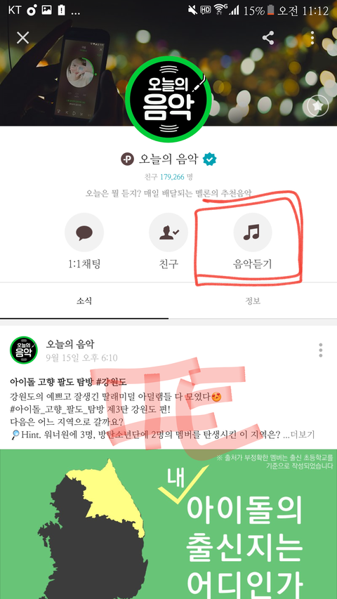 카1톡에 오늘1의음악 플러스친구 추가하구저기