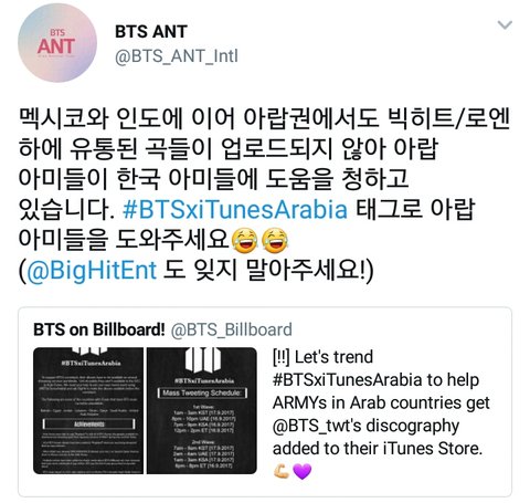지금 비키트랑 로/엔에서 유통된 곡들이 업로드가 안됐대! #BTSxiTunesArabia 아랍 이삐들이 ㅇㅏE튠즈에서 노래 들을 수 있게 한 번씩이라도 해쉬태그 올리자!