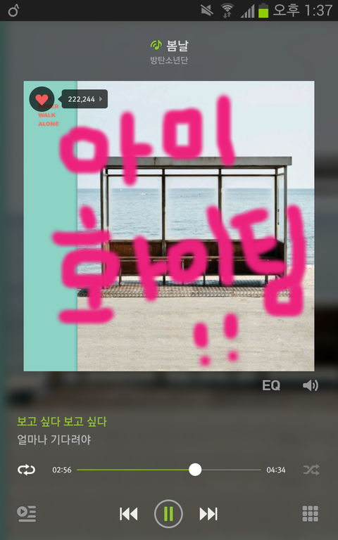 아 그리고 다른 글들 보니까 스밍인증?을 하시더라구요 그래서 저도 봄날 아직까지도 열시미 듣고 있으니 살짝쿵 놓고 갑니다ㅎㅎ 어쨌든 감사합니다... 문제가 된다면 이 글은 바로 삭제 하겠습니다...