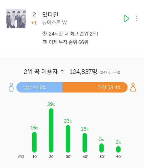 이거 우리 2000일 때 2위했을때 캡쳔데 우리가 의외로 남자들이 곡을 많이 듣나봐 남성 비율이 41%까지 나왔어. 총공때라 머 가족들 걸로도 했을 수도 있긴한데 쨋건 남성 비율이 저정도까지 나왔다는건 우리가 100% 팬덤형은 아닐수도 있어. 그니까 우리가 팬덤도 그렇게 크지 않으니까 생각보다 머글들도 꽤 들어주는것 같아.