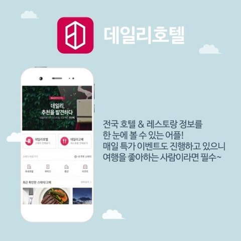 여행지에서 나에게 맞는 숙소를 고르는 꿀어플!전국 호텔 정보뿐만 아니라수시로 특가 이벤트를 진행하고 있어잘만 노린다면 유명 호텔도 비교적 저렴하게 묵을 수 있다는 사실+_+)