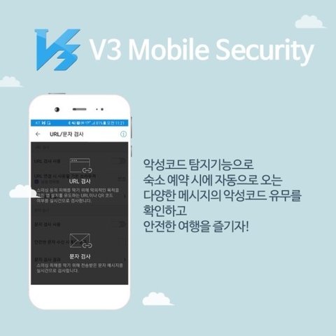 얼마 전 숙박 어플 해킹 사고로 개인정보가 유출되는 일이 있었는데,안랩 V3 모바일 시큐리티 어플의 개인정보 클리너 기능과 악성코드 탐지기능으로예약정보 등 자동으로 오는 문자안의 링크까지필터링해서 안전한 여행을 즐기자!