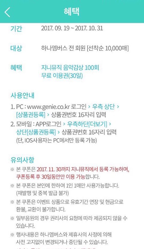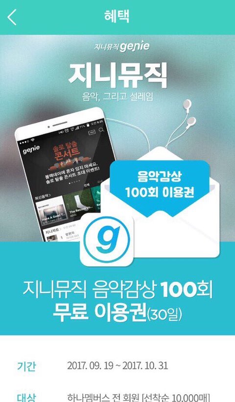 ㅎㄴㅁㅂㅅ 가입시 선착순 10000명에게 음악감상 100회 무료이용권을 준다고 합니다!! 컴백 대비해서 모아주세요 10월 10일부터 사용 부탁드립니다