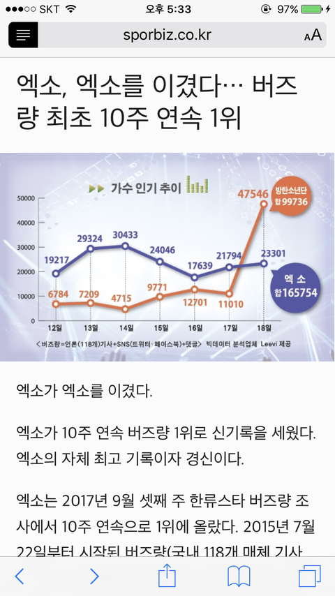 엑소 10주 연속 버즈량 1위 '신기록'
