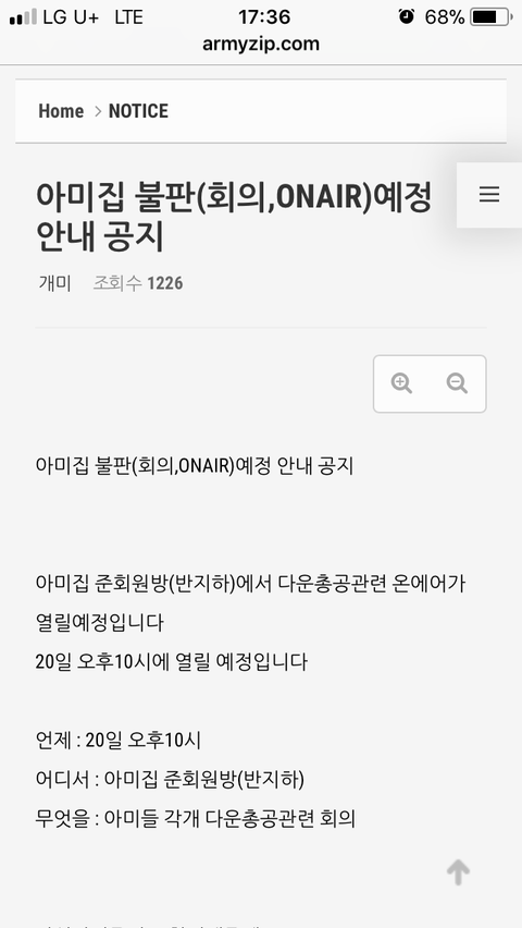 우리 싸이트 armyzip에서 오늘 저녁 10시 다운총공 불판 관련 회의예정이래!!!!!!! 가입하고 다 회의 참석하자!!!!!!
