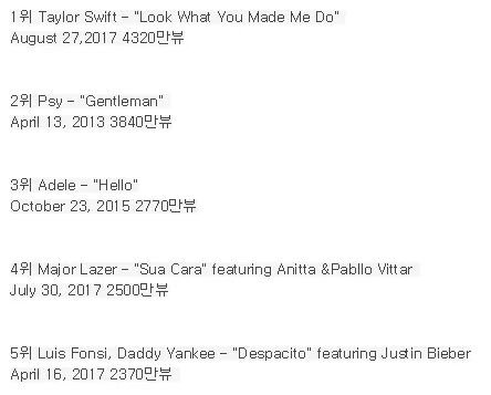 역대 유튜브 뮤비 24시간 조회수 세계 6위