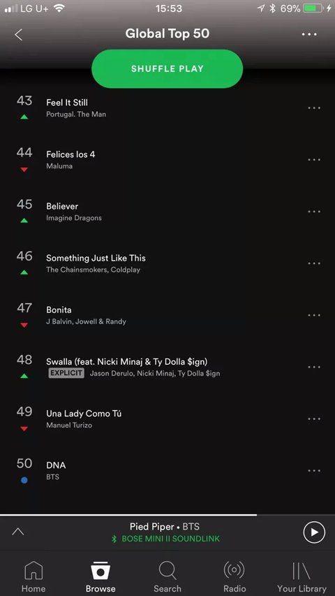 스포티파이(음악스트리밍서비스) 글로벌 TOP 50 첫 진입