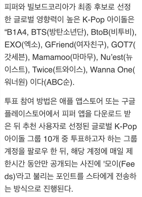 피.퍼 빌보드 2017 하반기 아이돌 1위