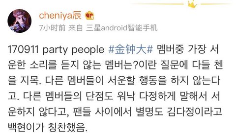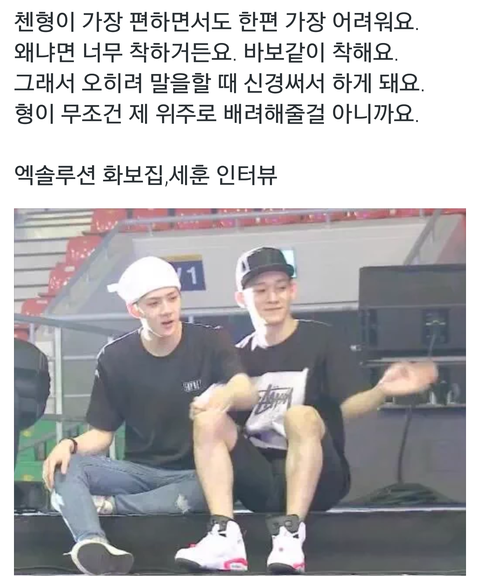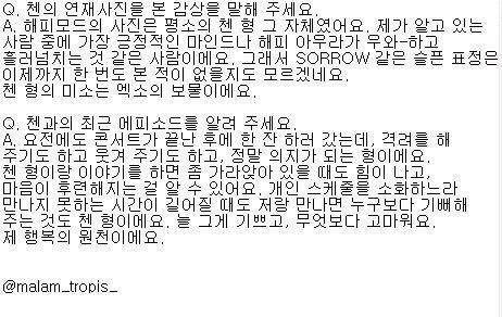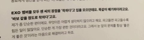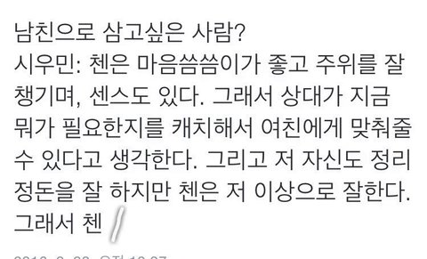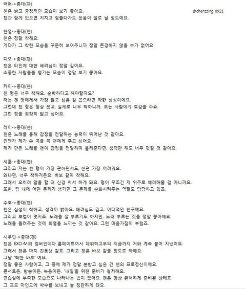 멤버들이 첸에 대해 인터뷰 할때마다 항상 들어가는 단어"착함, 다정, 펑키"