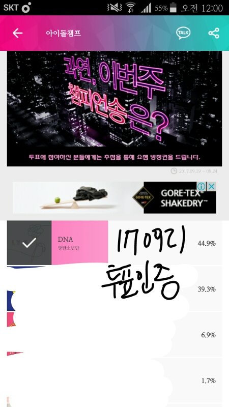 아이돌11챔프 앱 깔아서 검색창에 샘피언송 치면 제일 첫 번째로 나오는 9월 4주차 챔피언송 투표 해줘 출석체크 하면 투표권3개 받아!