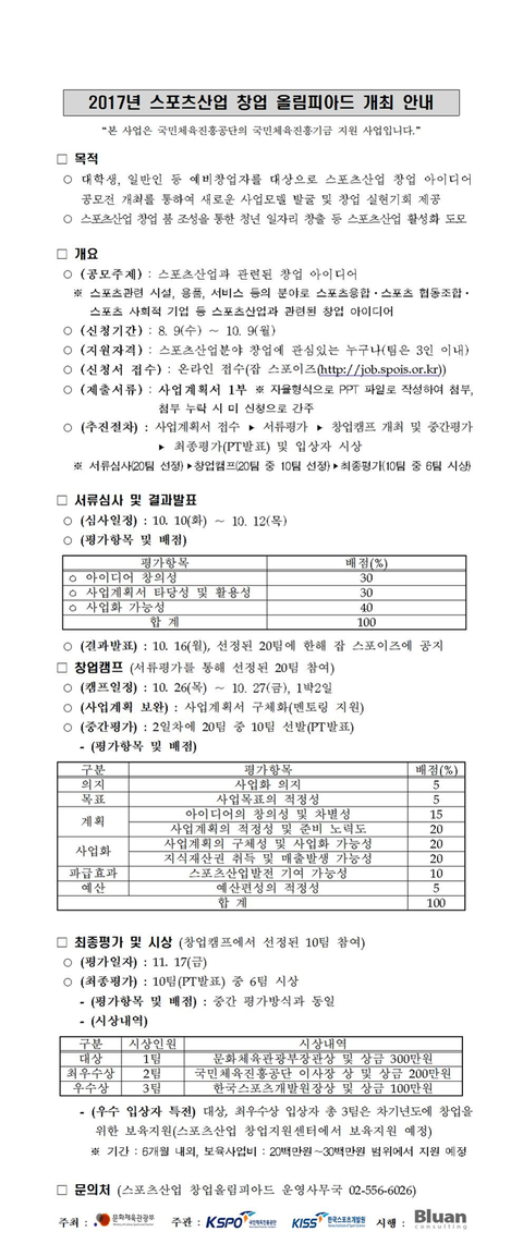 □ 문의처 (스포츠산업 창업올림피아드 운영사무국 02-556-6026)