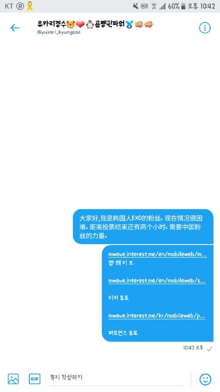 大家好,我是韩国人EXO的粉丝。 现在情况很困难。 距离投票结束还有两个小时。 需要中国粉丝的力量。