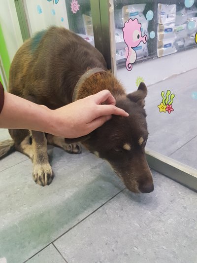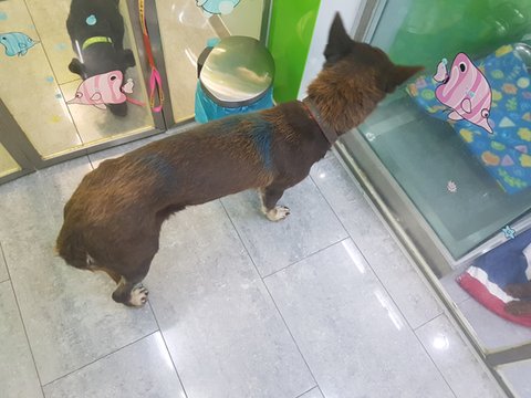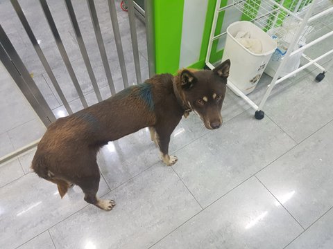 갈색 개이기 때문에 등에 파란색 락카로 표시를 한것으로 추정되며 도살 직전에 그곳에 탈출해 누군가의 신고로 119에서 안전하게 아이를 포획해 보호소에 왔더군요.