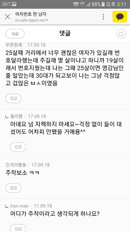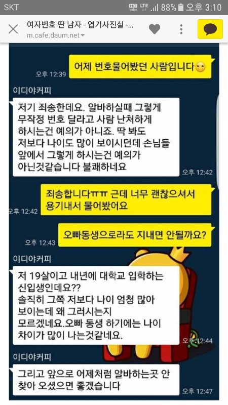 딱 보니까 저 새끼 직원 계속 귀찮게해서 어쩔 수 없이 번호 준 것 같은데 하는 말이 "그럼 번호 주지를 말든가" 이지랄ㅋㅋㅋㅋㅋㅋㅋ게다가 미성년자한테 꼬리쳤는데 빠개는거 조카 극혐