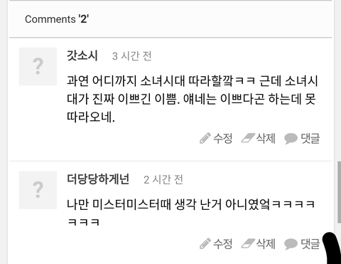 미친 소퀴들 너흰 핑클 나우 수트의상 따라했자나‥ 세상의 중심이 지들인줄 착각하고자빠졌네‥ 더군다나 저건 앨범자켓사진도아니고 팬들위한 팬미팅 티저 선물인데‥ 전국의 여자정장 수트 다까고다녀라ㅋㅋㅋㅋ미친련드라