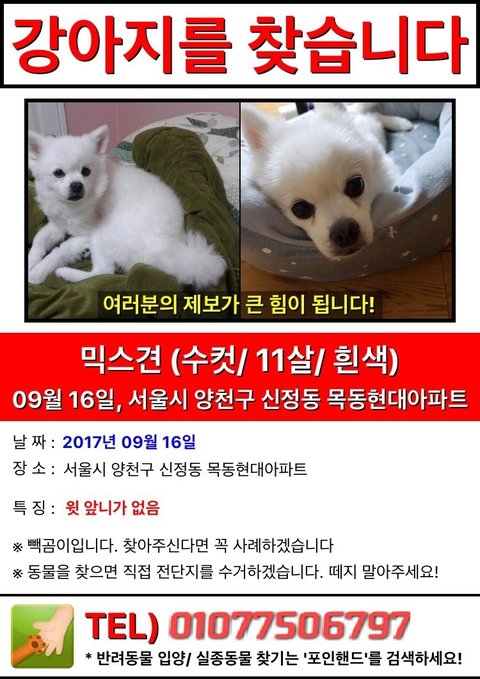 서울특별시 양천구 신정2동 목동현대아파트 102동에서 강아지를 잃어버렸습니다.