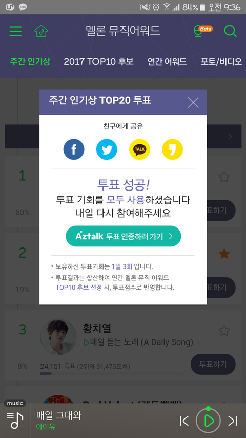 난 출근길에 열심히 들었어 ㅎㅎ 다들 노래 들으면서 까먹지 말구 멜론 투표하쟈!!!