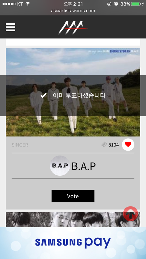 http://asiaartistawards.com 투표하자!!꼭! 얼굴책이랑 초록검색창 둘 다 로그인가능하니까 아이디 있는거 다 해 줘!!
