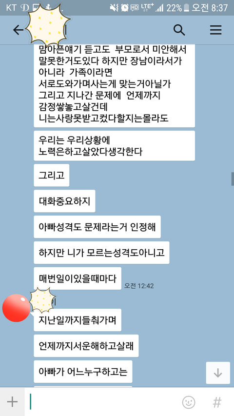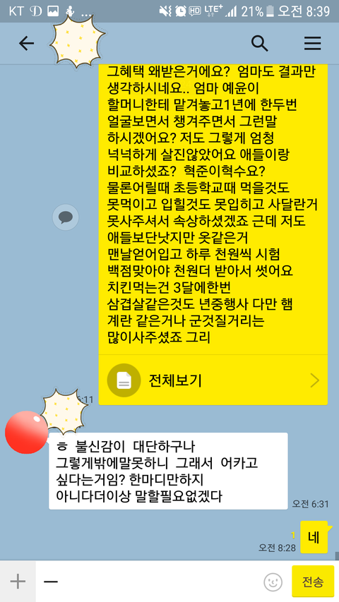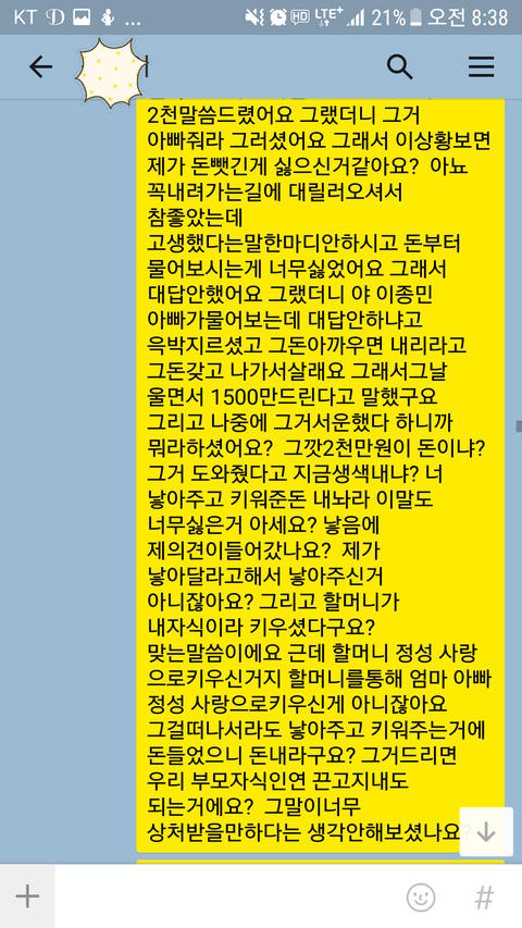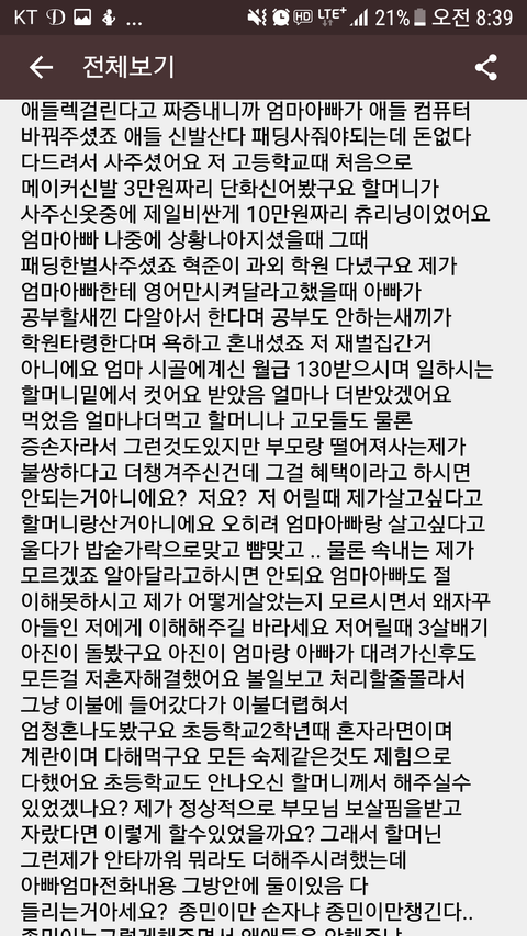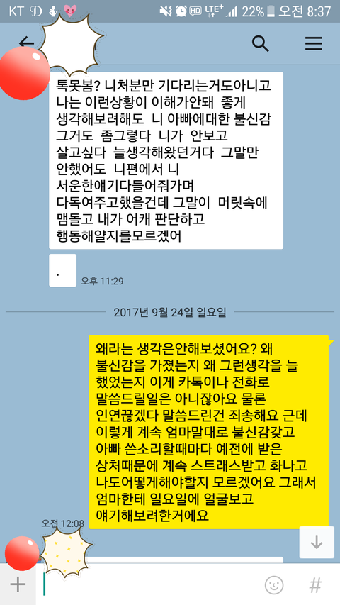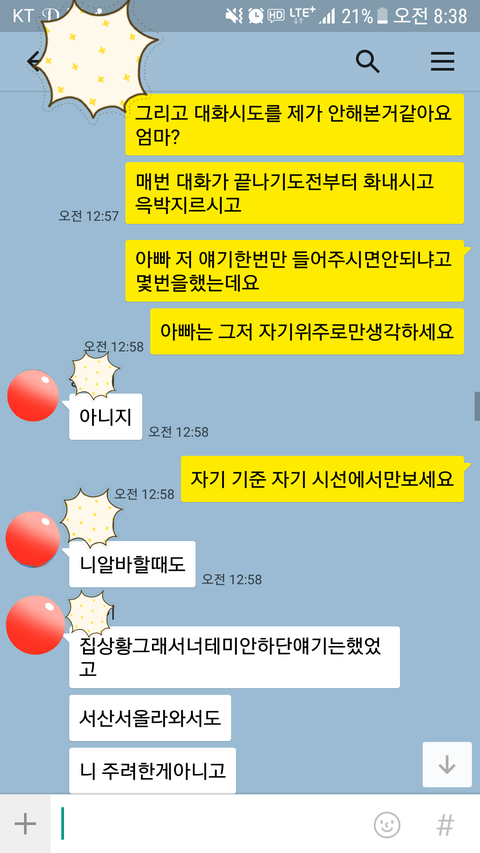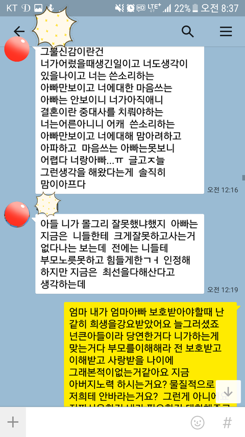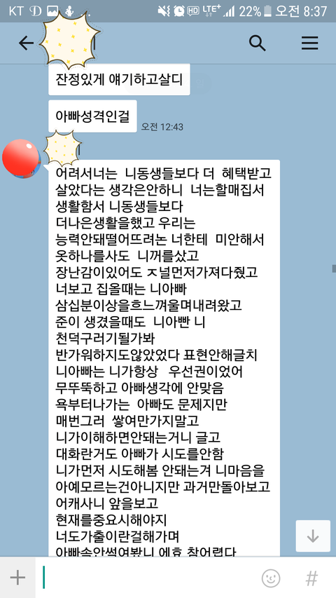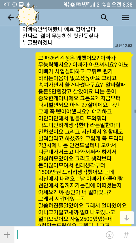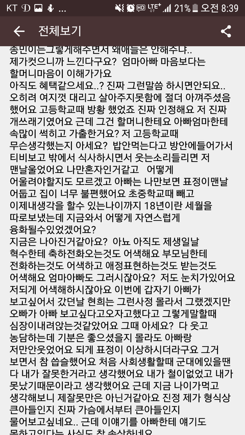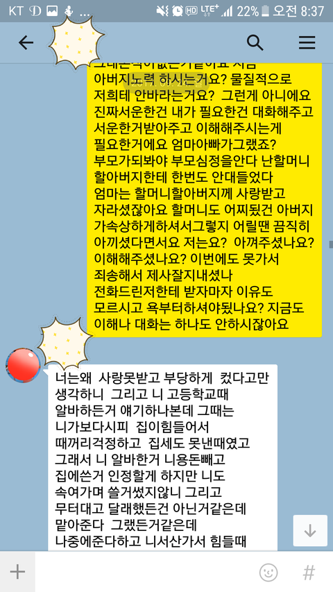중간에 끈긴건 사진수 제한으로 끈겼네요 5살때 엄마가 집나가시고 6살쯤 지금엄마가오신걸로기억해요 5살부터 17살까지 할머니랑 단둘이살았고 그후 부모님과살았습니다 제가생각이 틀린건지..어디 얘기할때도없고 조언을 구할때도없네요 예전얘기 들춰내는거 죄송하지만 아직까지 아버지랑 이런얘기 못해봤어요 이젠 제가 싫어요.. 대화도중 윽박지르고 때리고 던지고 그래서 매번 대화시도때마다 욕만먹고 할말도 다못해봤네요 그렇게 해소를 못하고 쟁여만놓고 살았는데 왜 옛날얘기까지 해서 뭐라하냐 하시는데 정말 제가 잘못하고 있는건가요?