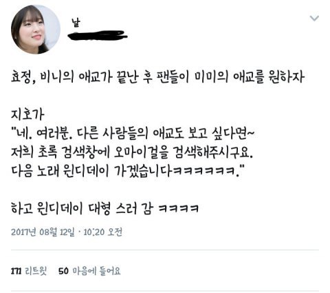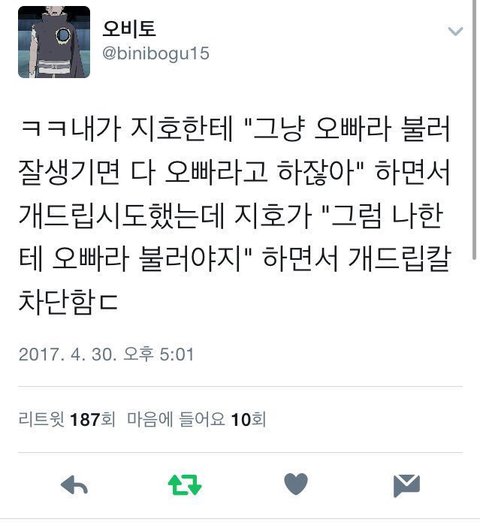 ㅋㅋㅋㅋㅋㅋㅋㅋㅋㅋㅋㅋㅋㅋㅋㅋㅋㅋㅋㅋㅋㅋㅋㅋㅋ오빠라고 부르라며 마음대로 저러는 팬에게 한 방을 먹임 ㅋㅋㅋㅋㅋ 지호를 잘 모르는 머글들은 쟤가 누군데 저런 말을 해? 할 수도 있겠지만 김지호 잘생김을 보시죠