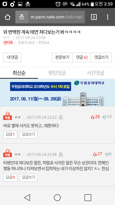 판 연령대 어리고 여론몰이 쉬워서 베플 빨리빨리 갈라야돼