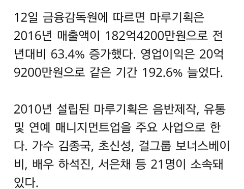 박지훈팬들 마루기획 후려치는거 한심하다. 현실은 씨스타,몬스타엑스,우주소녀 있는 스타쉽보다도 매출 높은 기획사가 마루기획