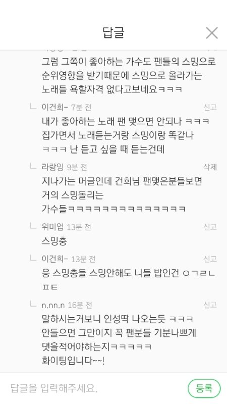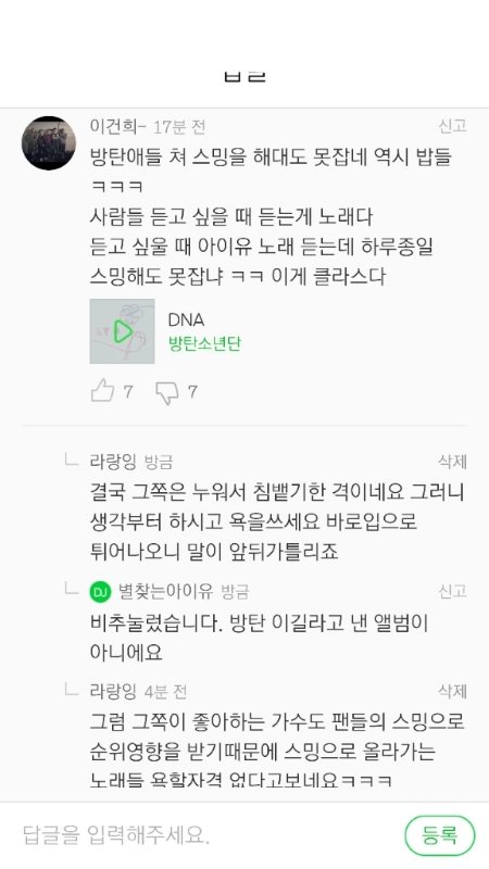 댓글창에 이런류의 병신보면 못참겠더라ㅜ억지부리기 대마왕인듯ㅋㅋㅋ 니네 힘내 ㄹㅇ 솔직히 너희들도 돈주고 듣는 한편의 이용자들인데 까내루고 욕하고 그러는거보면 치가떨리더라ㅋㅋㅋㅋㅋㅋㅋㅋㅋㅋ 이번노래좋고 앞으로더 발전할거같다 난 니네가 너무좋아 다착해 애들이 하도저리치이고 이리치여서 기죽은거같아서 마음아프더라 악플걍다무시해 화이팅!!