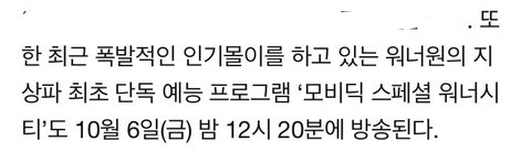 스브스에서 추석때 워:너시티 방송해 준대. 잘 기억해~~