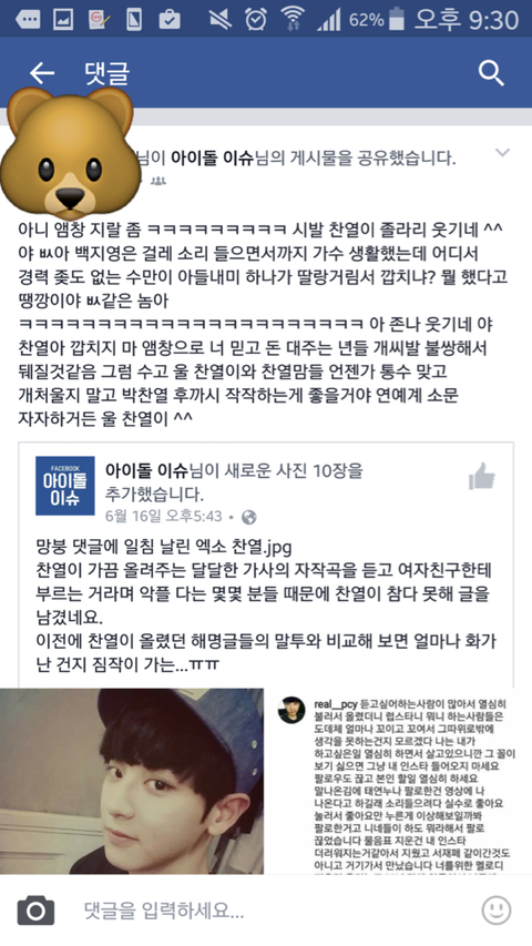 찾다보니까 찬열 말고 다른 멤버들 욕한것도 있는데 다른멤버들은 어디로 보내야돼? 그리고 이정도 수위면 확실히 고소미 먹겠지? 전부 2016년에 쓴 글들이라서 지금은 지워졌고 캡쳐본만 있어