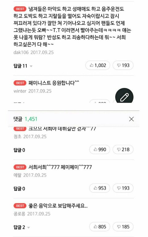 페미니스트 언급 하나에 저렇게 빨아대는 인간들 진심 뇌한번 열어보고 싶다 진짜 쟤 마약했잖아 그것도 대마초로만 알고있던데 쟤 대마초보다 엄청 쎈 마약도 했어 대마로 묻혀진거지 집행유예까지 받은 전과자인데 반성하니깐 너무 그러지 말라고..? 세상이 무섭다 진심 저런애다 아이돌 한다니깐 아이돌이 뭔 장난인가 싶고 돈도 많다며; 도대체 왜 아이돌 하려는지 본인피셜대로 진심 관종중의 관종인듯 설리는 진짜 발똡의 때였어 ㅋㅋㅋㅋㅋ
