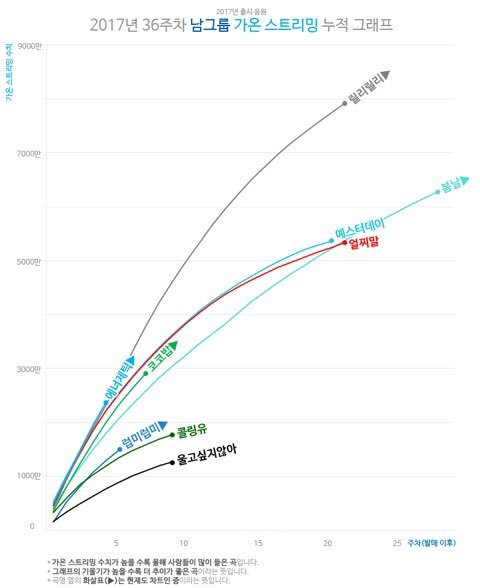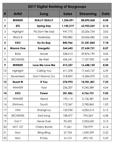 2017 남자아이돌 다운로드,스트리밍 순위 최신판