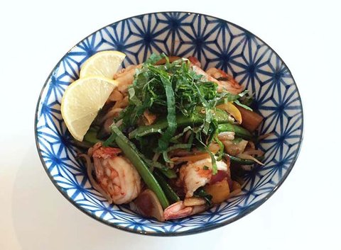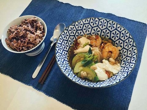 밥 위에 풋콩 새우 마늘 배추 숙주나물 파프리카 가지 파 그리고 레몬 깻잎